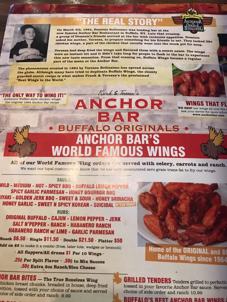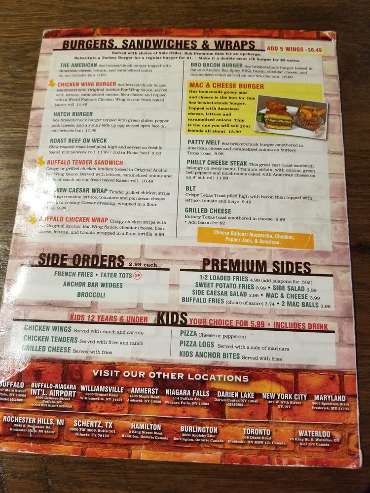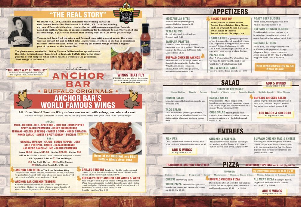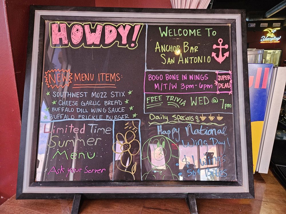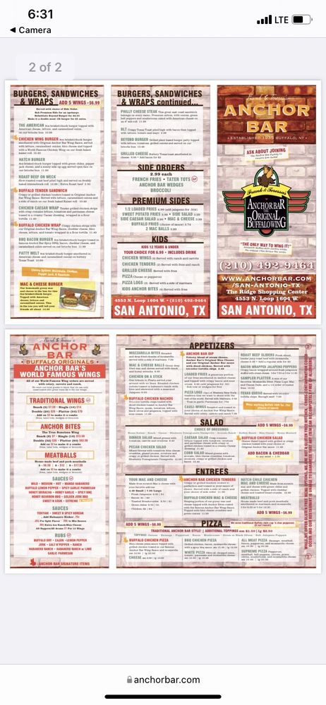 Introducing the menu at Anchor Bar, located in San Antonio, TX, known for its American bar atmosphere and famous chicken wings. This veteran-owned establishment offers a variety of beverages, appetizers like Mozzarella Bites and Buffalo Chicken Nachos, refreshing salads such as Pecan Chicken Salad, and thirst-quenching drinks like Fresh Squeezed Lemonade. The reviews rave about the delicious wings in flavors like Lemon Pepper and Honey Bourbon BBQ. Customers praise the friendly service and lively game day atmosphere, making it a great spot for sports fans. Don't miss out on the tasty food, vibrant ambiance, and exceptional service at Anchor Bar – a must-visit for wing lovers and those seeking a fun dining experience.