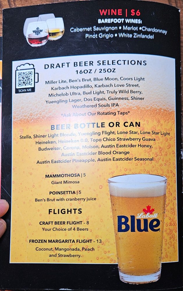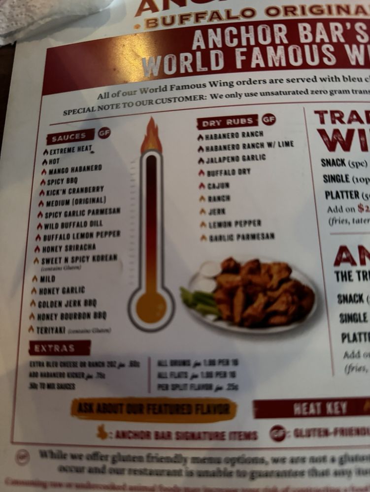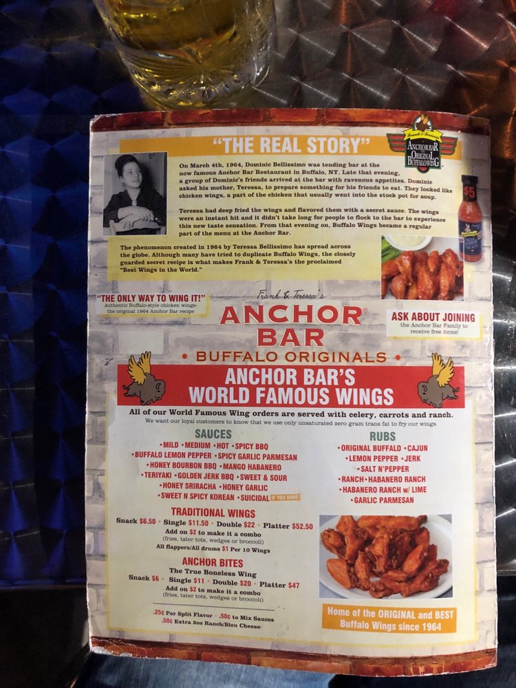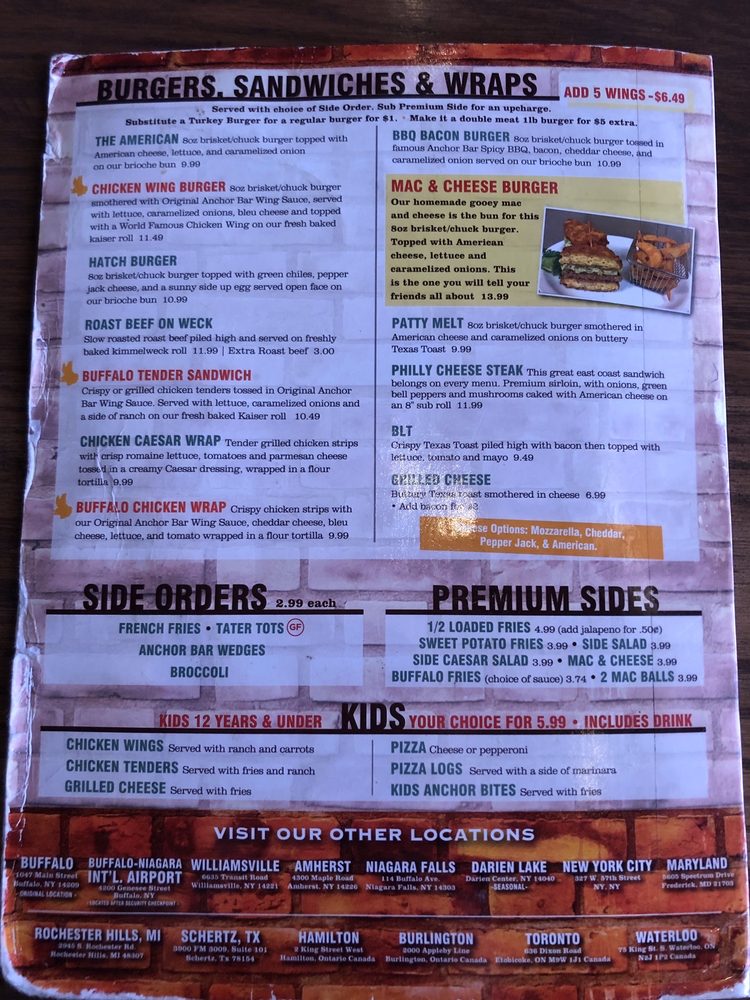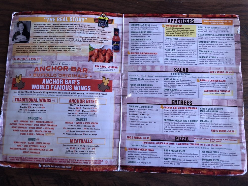 Introducing the menu at Anchor Bar, located in San Antonio, TX, known for its American bar atmosphere and famous chicken wings. This veteran-owned establishment offers a variety of beverages, appetizers like Mozzarella Bites and Buffalo Chicken Nachos, refreshing salads such as Pecan Chicken Salad, and thirst-quenching drinks like Fresh Squeezed Lemonade. The reviews rave about the delicious wings in flavors like Lemon Pepper and Honey Bourbon BBQ. Customers praise the friendly service and lively game day atmosphere, making it a great spot for sports fans. Don't miss out on the tasty food, vibrant ambiance, and exceptional service at Anchor Bar – a must-visit for wing lovers and those seeking a fun dining experience.